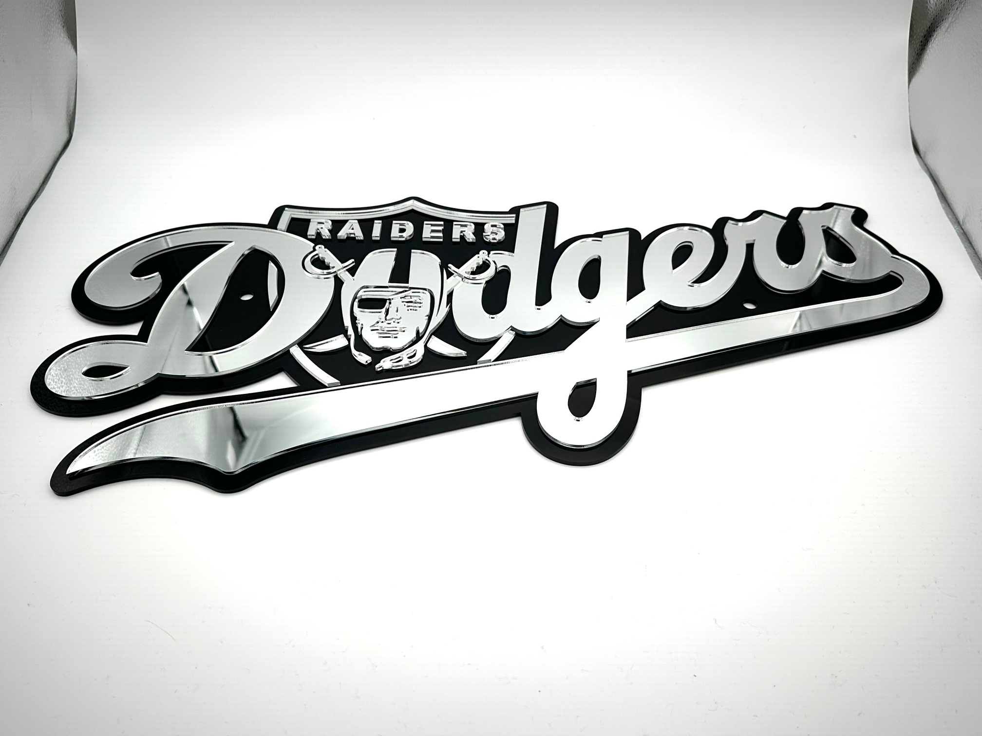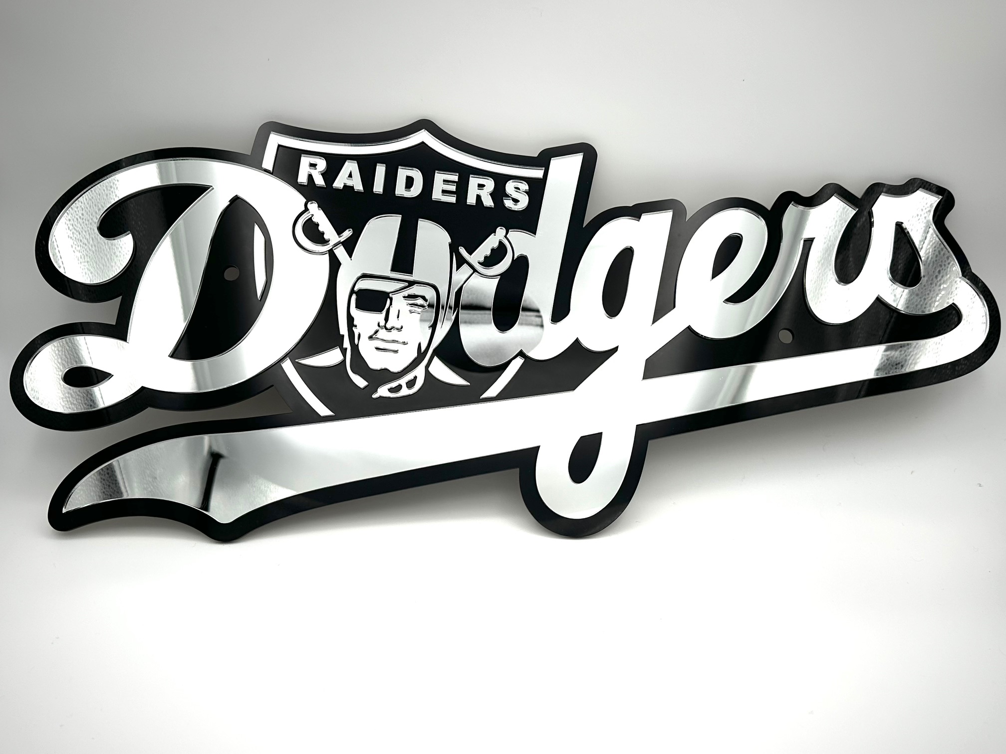 Dodgers Raiders wall plaque with two 1 inch off set wall mounts, for a very clean display on any wall or man cave.