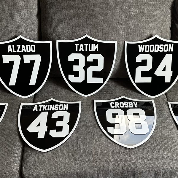 This is a 11.8×12.5 inch glossy black & glossy grey Raiders shield wall plaque with two 1 inch off set wall mounts, for a very clean display on any wall or man cave.